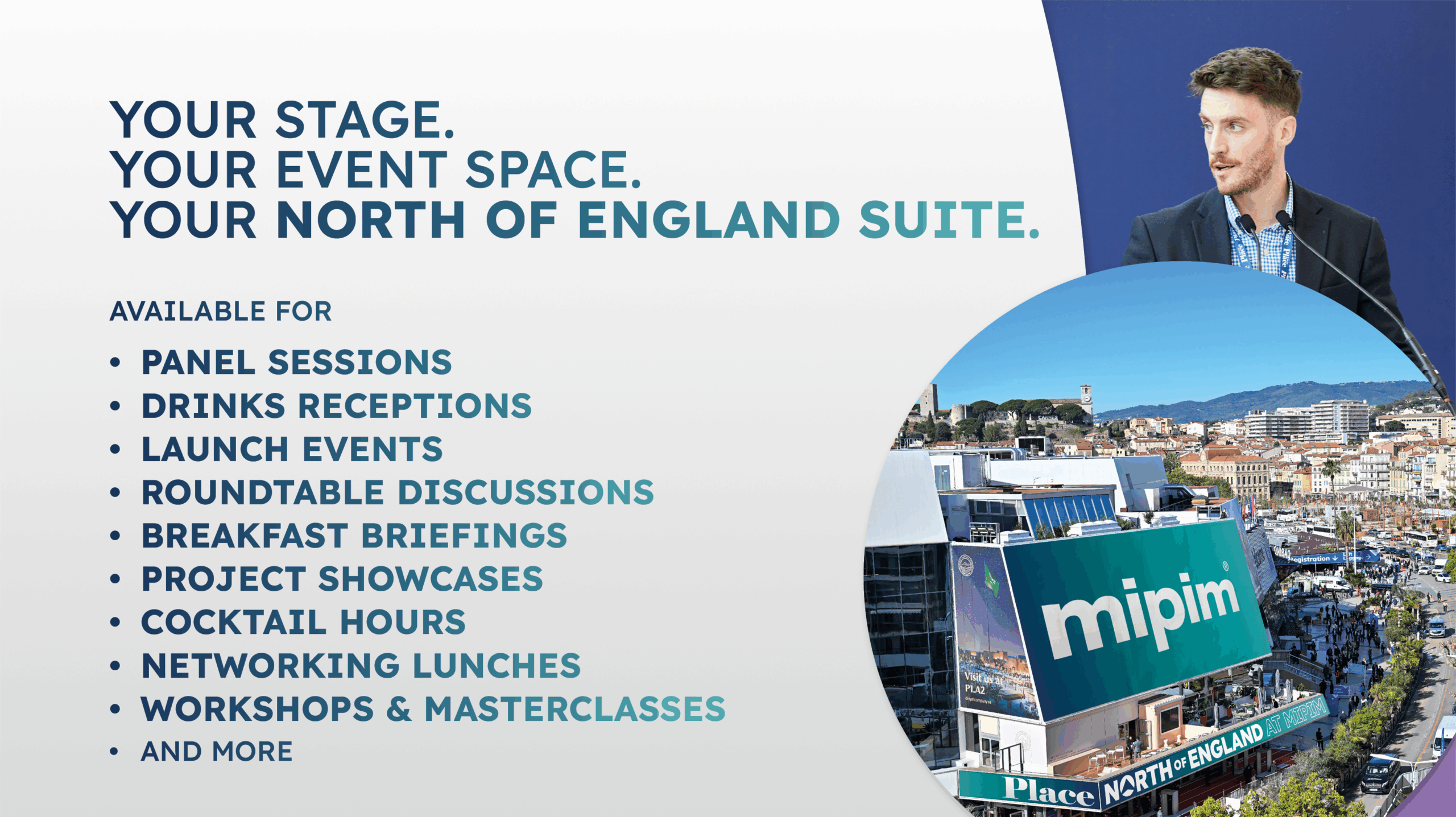 The North of England Suite at MIPIM is a new multi-use indoor and outdoor space, located at the centre of the Palais. Designed with flexibility in mind, it’s the perfect setting for panel sessions, roundtables, and networking events. From thought-leadership discussions to relaxed drinks receptions, the suite provides a welcoming environment to connect with investors, industry leaders, and collaborators – amplifying the North of England’s visibility and influence on the international stage.