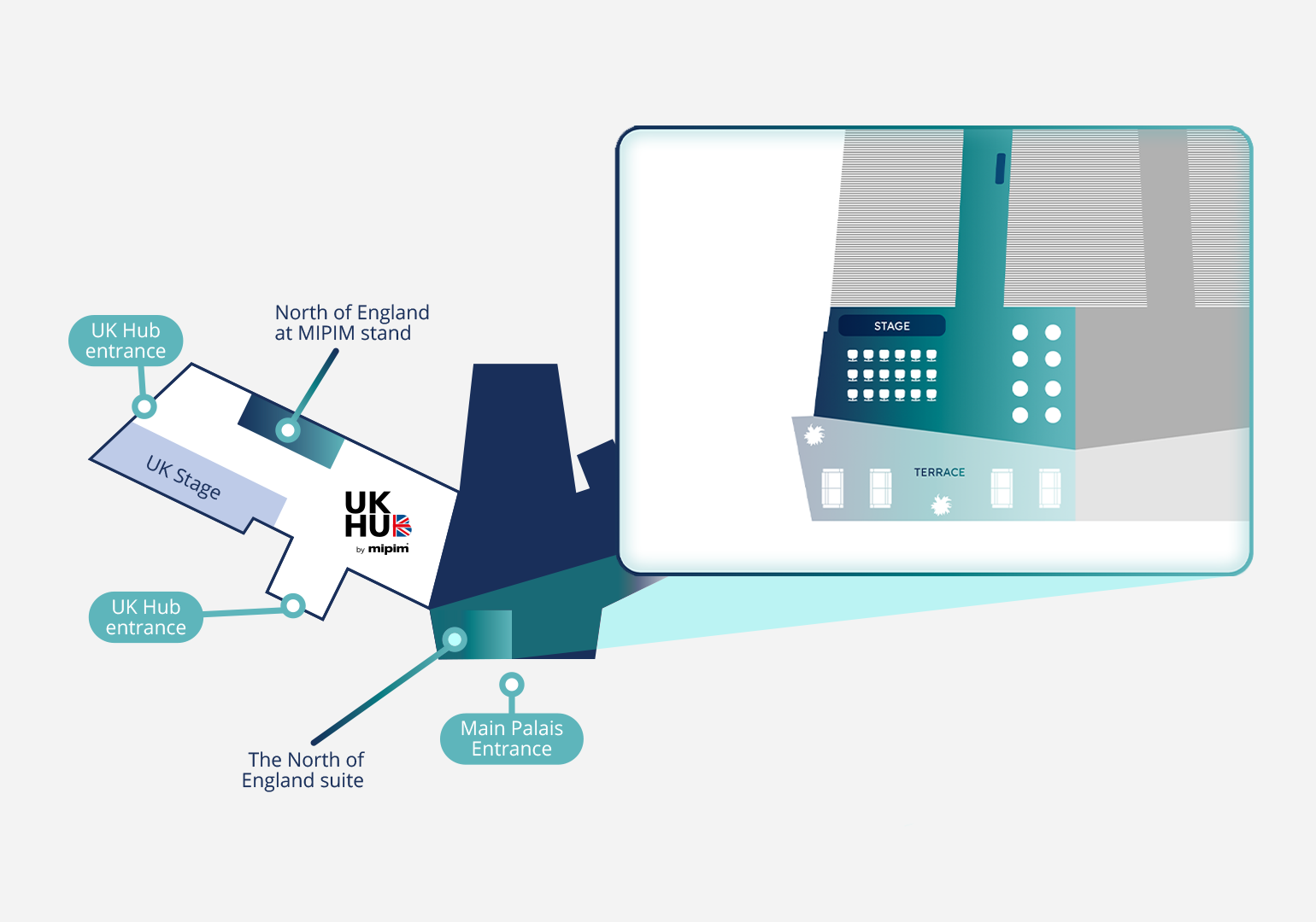 Prominently located at the entrance to the Palais and just a short walk from the North of England Stand and UK Hub, the North of England Suite is a perfect opportunity to showcase the region’s ambition, highlight your organisation’s expertise, and connect with global investors and decision-makers in a professional yet welcoming setting.